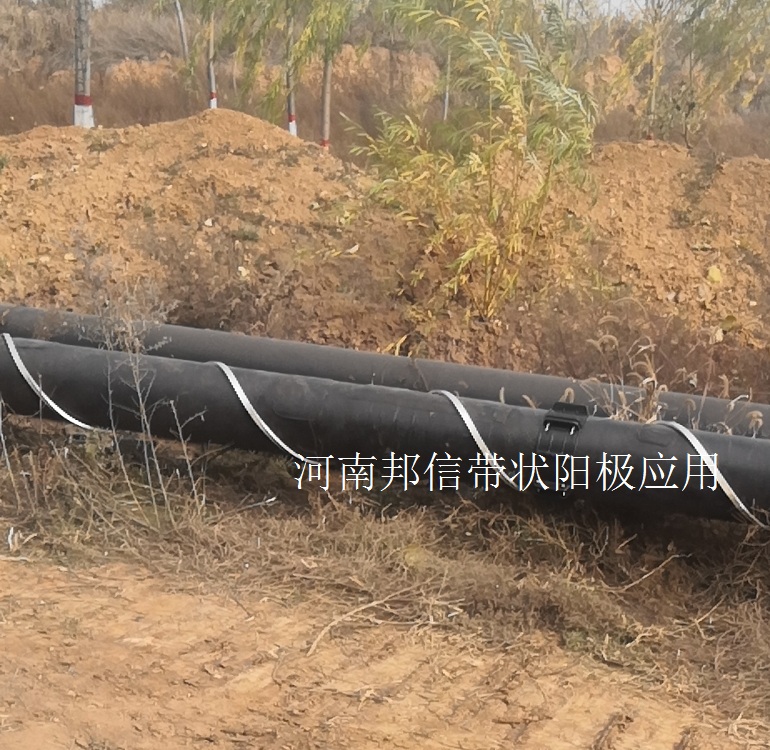 儲油區入口處鋼套管內鎂帶陽極保護。根據線路工程設計,在儲油區入口處每根輸油管設置了長約 70 米 DN400 的鋼套管,為了消減鋼套管的屏蔽作用,鋼套管內部使用 9.5*19 型鎂帶陽極對 DN250 管道 進行區域犧牲陽極防護。河南邦信陰極保護施工隊在套管內 DN250 管道上,每 1 米管道上,纏繞 2 米的 9.5*19 型鎂帶陽極。每 5 米管道,鎂帶陽極中的鋼芯與管道鋁熱焊接一次。